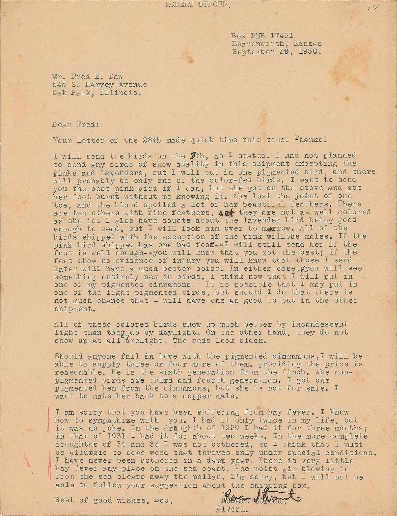 TLS, one page, 8.25 x 10.75, September 30, 1938. Written from Leavenworth Penitentiary, a letter to Fred E. Daw, in part: "I will send the birds of the 3th [sic], as I stated. I had not planned to send any birds of show quality in this shipment excepting the pinks and lavenders, but I will put in one pigmented bird, and there will probably be only one of the color-fed birds. I want to send you the best pink bird if I can, but she got on the stove and got her foot burnt without me knowing it. She lost the joint of one toe, and the blood spoiled a lot of her beautiful feathers. There are two others with fine feathers, but they are not as well colored as she is. I also have doubts about the lavender bird being good enough to send, but I will look him over tomorrow. All of the birds shipped with the exception of the pink will be males. If the pink bird shipped has one bad foot—I will still send her if the foot is well enough—you will know that you got the best; if the feet show no evidence of injury you will know that those I send later will have a much better color. In either case, you will see something entirely new in birds." Stroud makes several emendations in his own hand. In very good to fine condition, with scattered light staining.