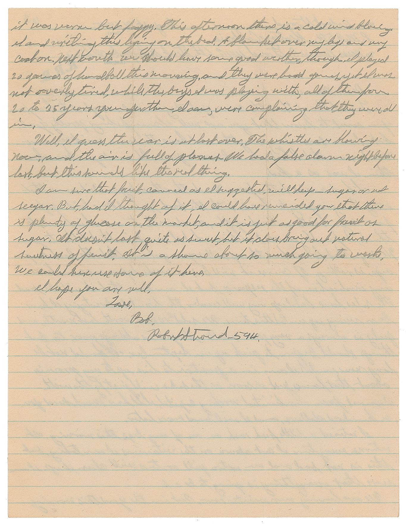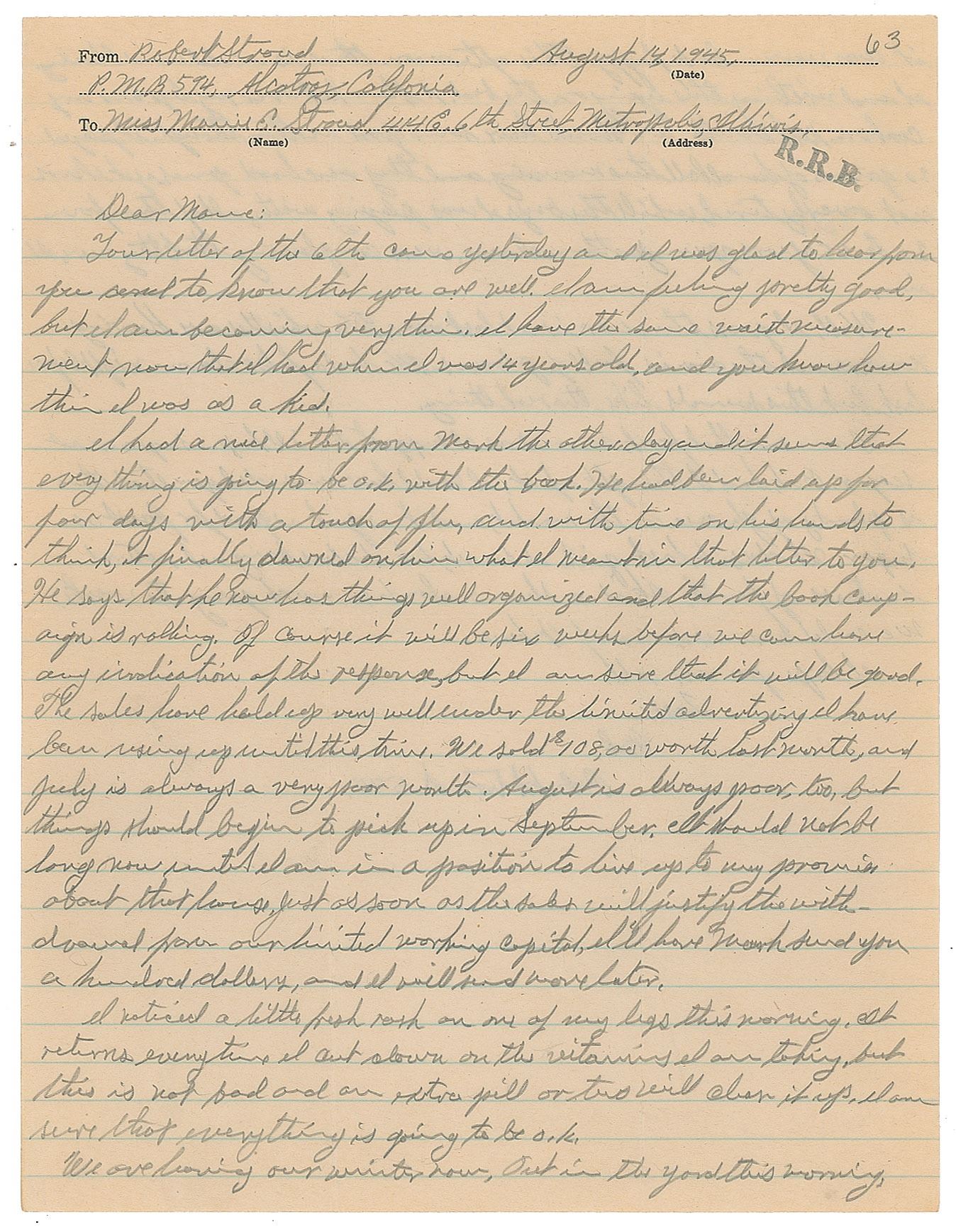 ALS in pencil, signed “Bob, Robert Stroud - 594,” one page both sides, 8 x 10.25, August 14, 1945. Letter written from Alcatraz, in part: "I had a nice letter from ark the other day and it seems that everything is going to be O.K. with the book…He says that he now has things well organized and that the book campaign is rolling. Of course it will be six weeks before we can have any indication of the response, but I am sure that it will be good. The sales have held up well under the limited advertizing I have been using up until this time. We sold $108.00 worth last month, and July is always a very poor month. August is always poor, too, but things should begin to pick up in September…We are having our winter now. Out in the yard this morning it was warm but foggy…Well, I guess the war is at last over. The whistles are blowing now, and the air is full of planes. We had a false alarm night before last, but this sounds like the real thing." Also signed at the head, "Robert Stroud, P.M.B. 594, Alcatraz, California." In fine condition.
