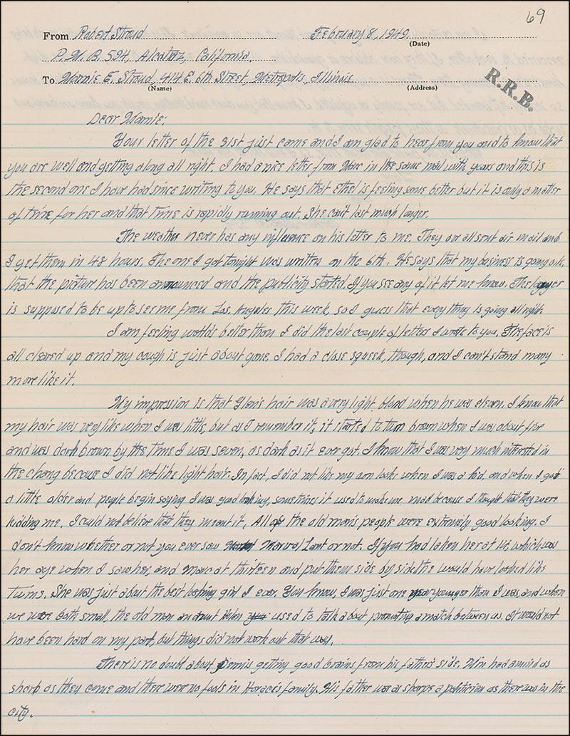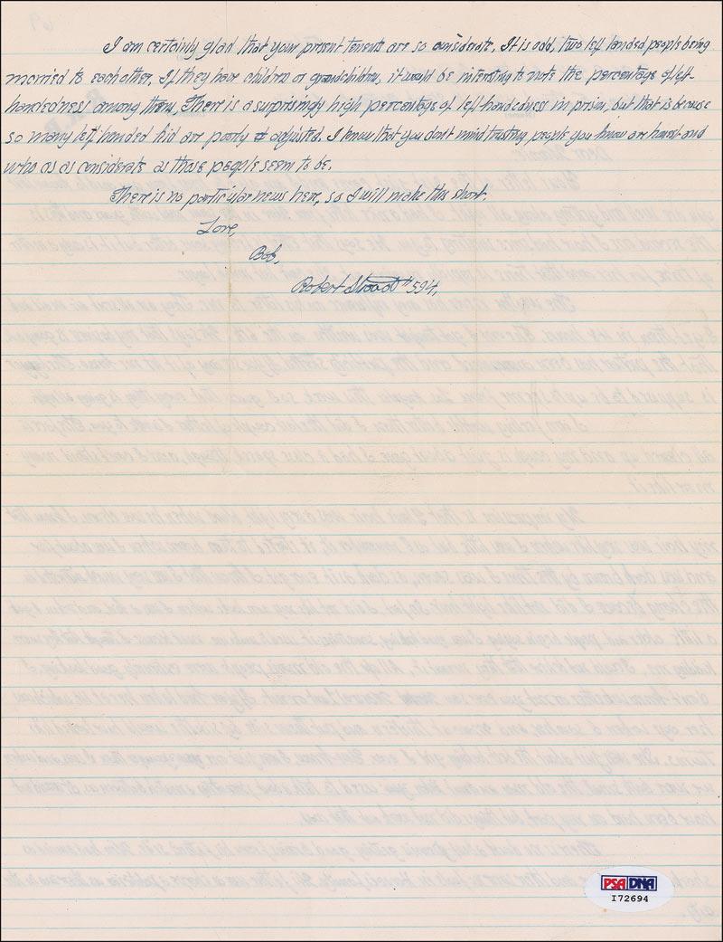 ALS signed “Love, Bob, Robert Stroud #594,” one page, lightly-lined both sides, 8 x 10.25, prison stationery to which he adds his full name and prison address at top, February 8, 1949. Stroud writes to his sister, Mamie. In part: “He says that my business is going o.k. that the picture has been announced and the publicity started. If you see any of it let know. The lawyer is supposed to be up to see me from Los Angeles this week, so I guess that everything is going all right.” In fine condition, with intersecting mailing folds. A PSA/DNA authentication label affixed to bottom back corner. Accompanied by a certificate of authenticity from PSA/DNA. RRAuction COA.