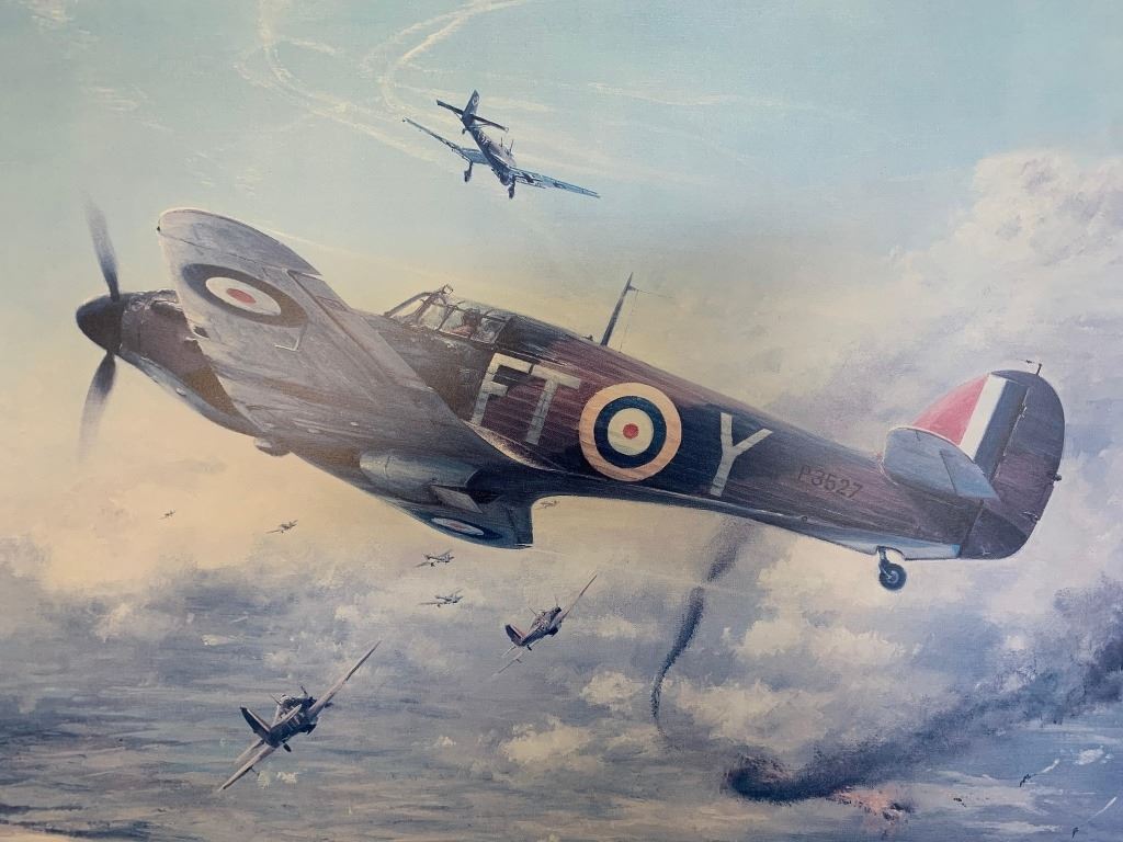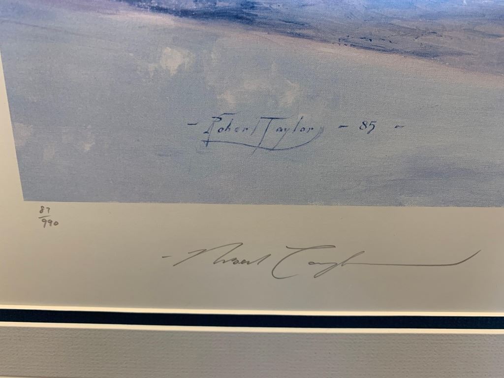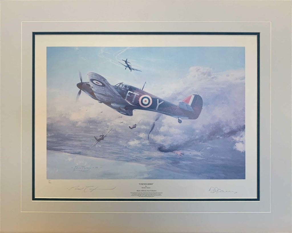 Robert Taylor's "Uneven Odds" limited edition print, signed and numbered 87/990. Signed by pilot Frank Carey. A magnificent aviation piece, depicting a flight during the Battle of Britain. This print is in mint condition, and has been professionally double matted with acid free matting.