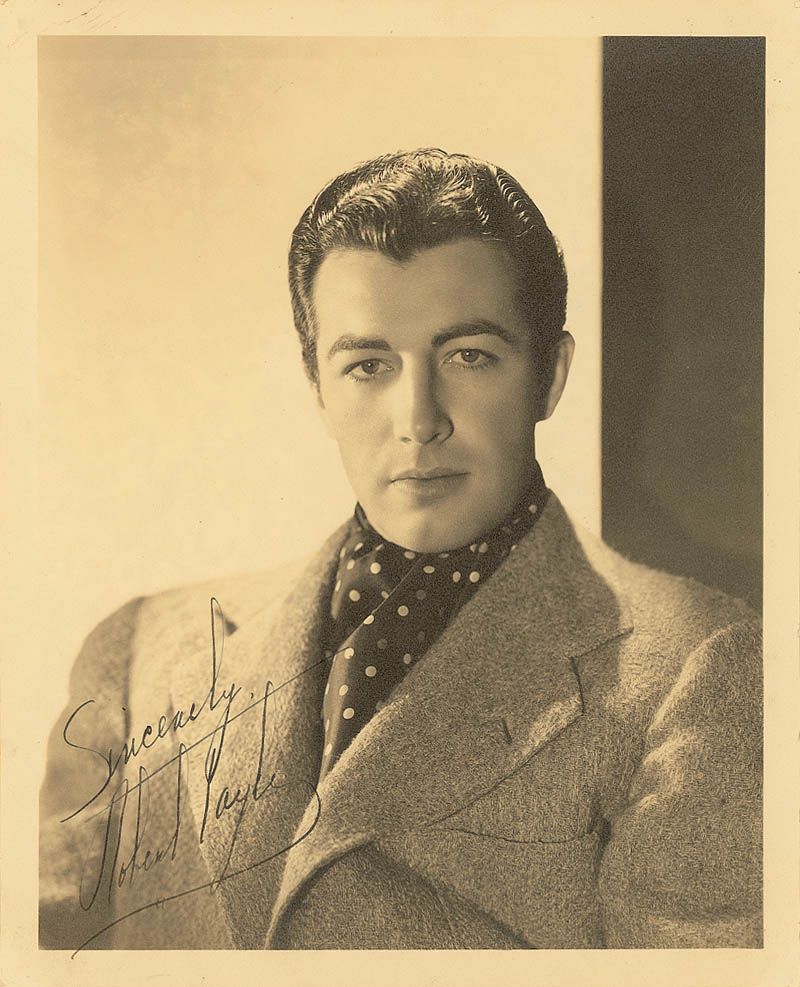 Debonair vintage matte-finish 8 x 10 photo of Taylor, signed in fountain pen, “Sincerely, Robert Taylor.” Some creasing to the upper left and silvering to dark areas of the image, otherwise fine condition.