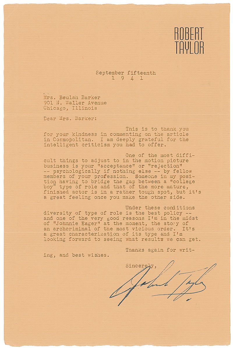 TLS, one page, 7 x 11, personal letterhead, September 15, 1941. Letter to an admirer. In full: “This is to thank you for your kindness in commenting on the article in Cosmopolitan. I am deeply grateful for the intelligent criticism you had to offer. One of the most difficult things to adjust to in the motion picture business is your ‘acceptance’ or ‘rejection’—psychologically if nothing else—by fellow members of your profession. Someone in my position having to bridge the gap between a ‘college boy’ type of role and that of the more mature, finished actor is in a rather tough spot, but it’s a great feeling once you make the other side. Under these conditions diversity of type of role is the best policy—and one of the very good reasons I’m in the midst of ‘Johnnie Eager’ at the moment, the story of an archcriminal of the most vicious order. It’s a great characterization of its type and I’m looking forward to seeing what results we can get.” In fine condition, with a few mild scattered creases and uniform shade of toning. Accompanied by the original mailing envelope.