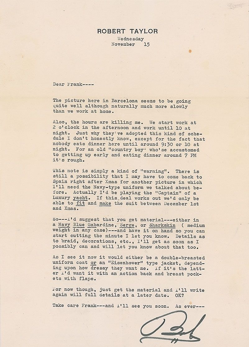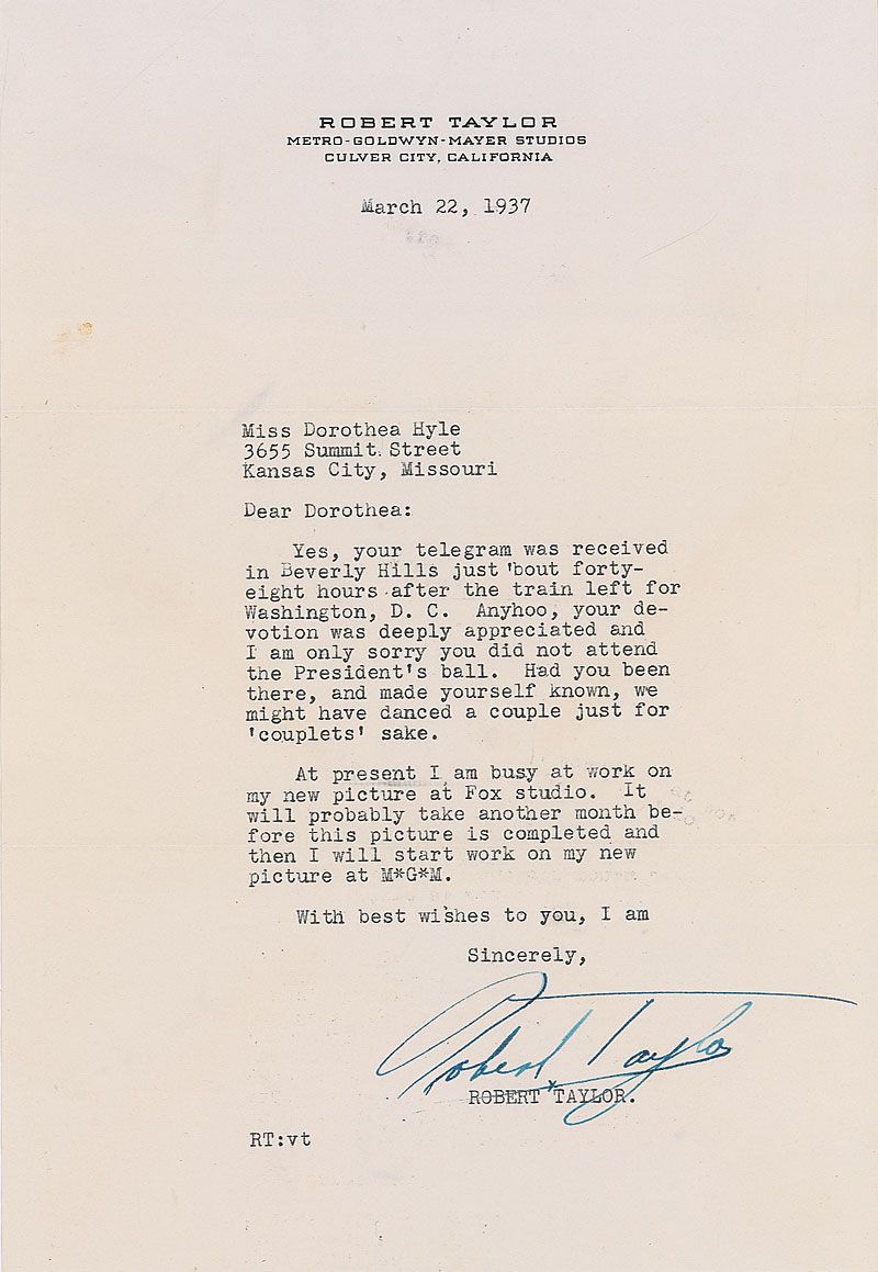 Two letters: TLS, one page, 7.25 x 10.5, personal letterhead, March 22, 1937, in part: “I’m only sorry you did not attend the President’s ball. Had you been there, and made yourself known, we might have danced a couple just for ‘couplets’ sake”; and one TLS to his tailor, signed “Bob,” one page, 7.75 x 10.75, personal letterhead, November 15, [1966], in part: “The picture here in Barcelona seems to be going quite well…except for the fact that nobody eats dinner here until around 9:30 or 10 at night…There is still a possibility that I may have to come back to Spain right after Xmas for another picture in which I’ll need the Navy-type uniform we talked about before.” Intersecting folds and overall creasing to the 1966 letter, otherwise overall fine condition. Accompanied by both original mailing envelopes and an unsigned glossy photo of Taylor.