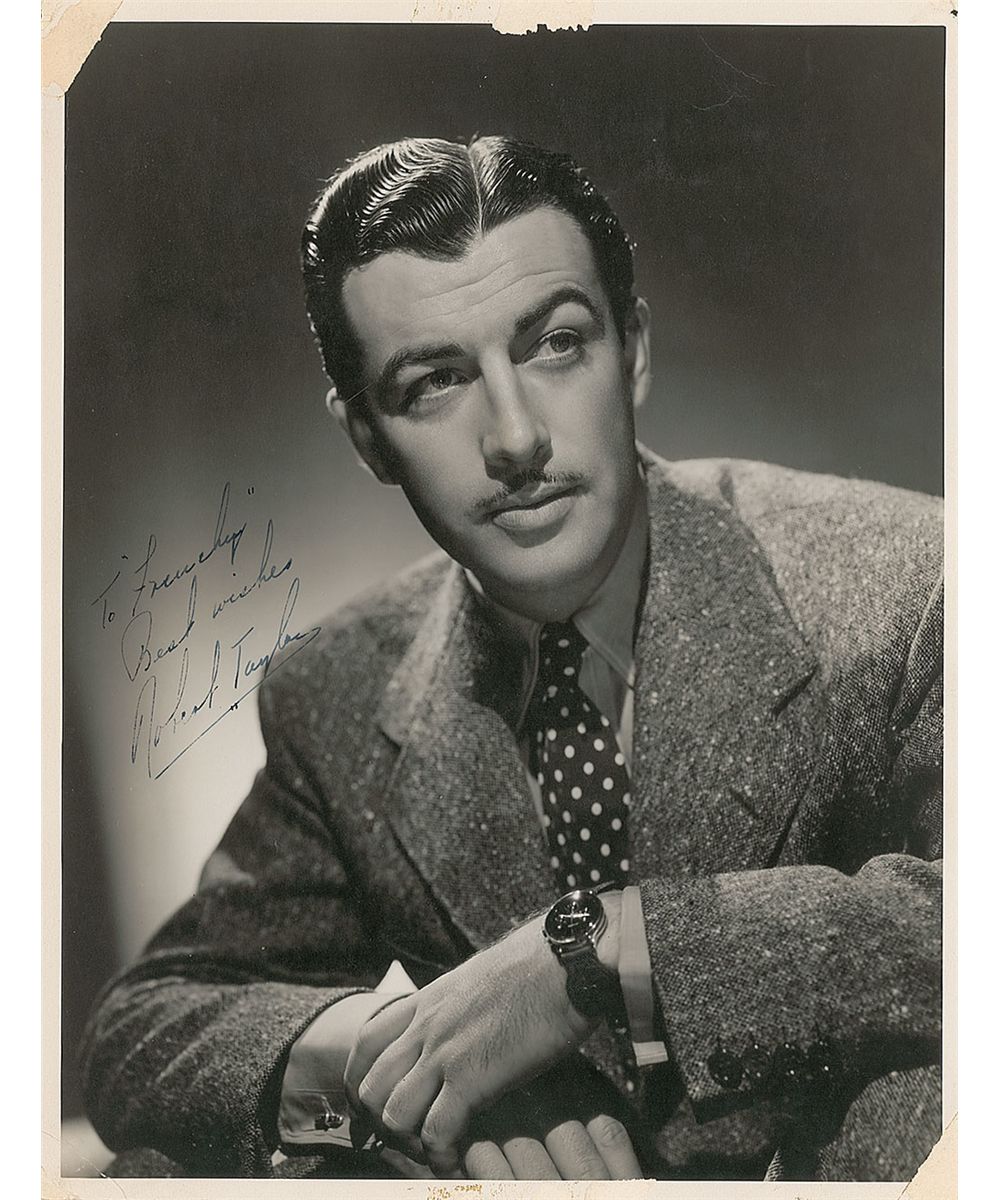 Handsome matte-finish 10 x 13 photo, signed and inscribed in fountain pen, “To ‘Frenchy’ Best wishes, Robert Taylor.” Creases and surface loss to three corner tips, and some surface loss along top edge, otherwise fine condition.