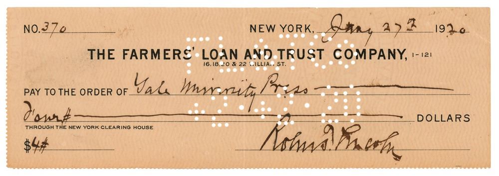 Farmers' Loan and Trust Company check, 7.75 x 2.5, filled out and signed by Robert Todd Lincoln, "Robert T. Lincoln," payable to the Yale University Press for $4, January 27, 1920. In fine condition.