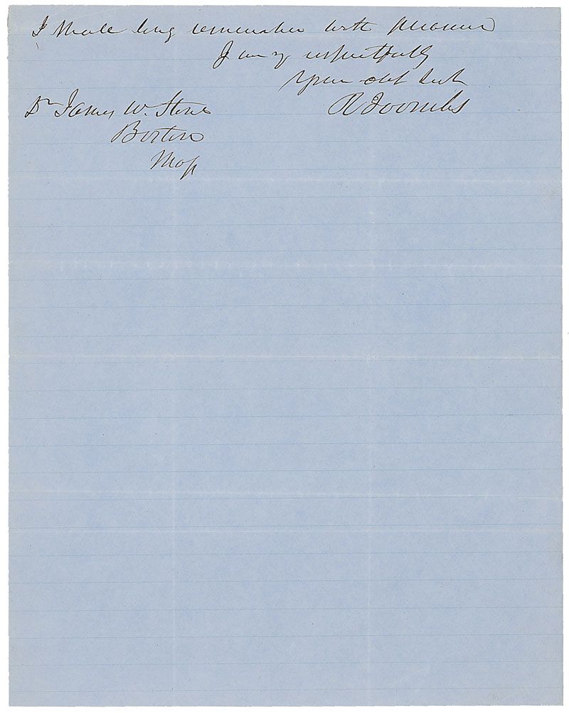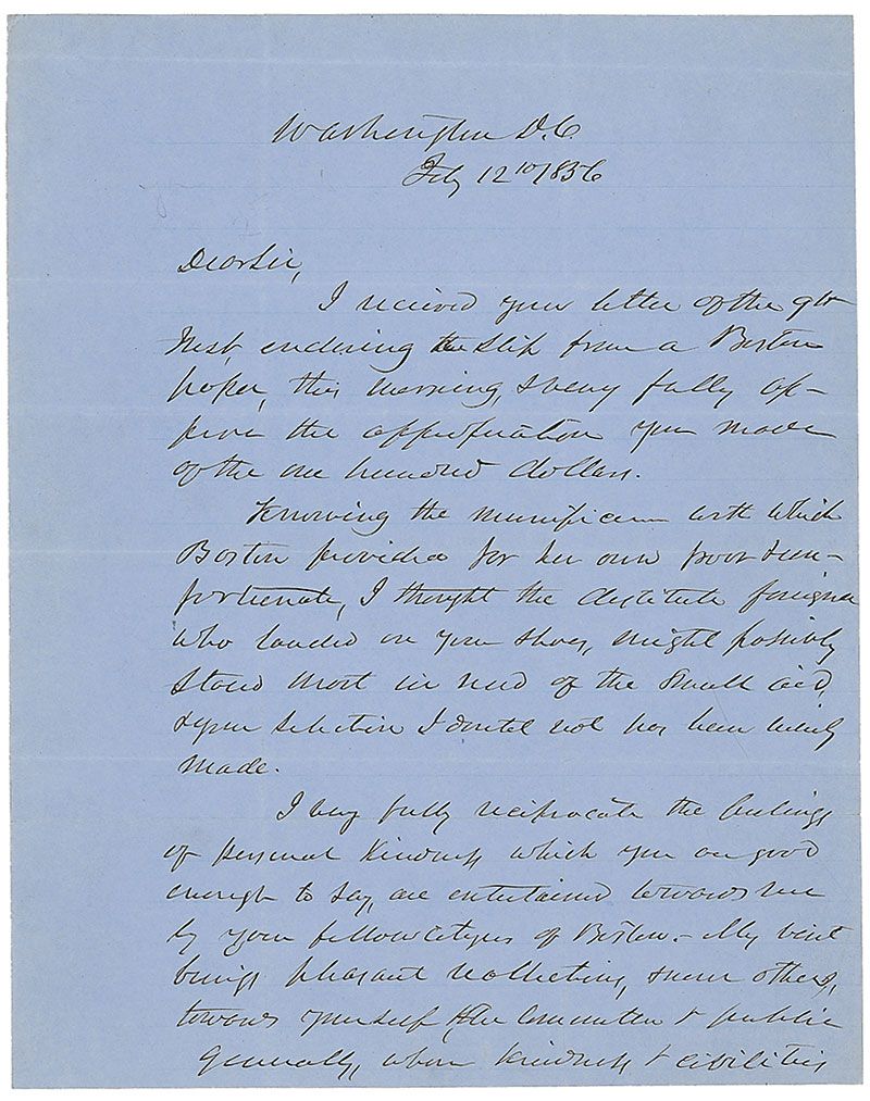 First secretary of state for the Confederacy, Toombs was a bitter rival of Jefferson Davis’s, and ran against him in the presidential election; he was later wounded at the Battle of Antietam. ALS signed “R. Toombs,” two pages, lightly-lined, 7.75 x 9.75, July 12, 1856. Letter to James Stone, thanking him for a donation. In part: “Knowing the munificence with which Boston provides for her own poor & unfortunate, I thought the destitute foreigner who landed on your shores might possibly stand most in need of the small aid.” In fine condition, with intersecting folds (one vertical fold passing through a single letter of the signature).