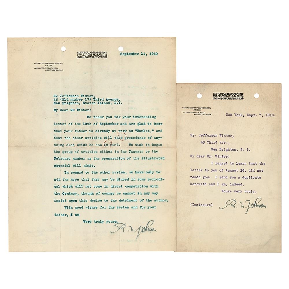 American writer, poet, and diplomat (1853–1937) who helped to develop international copyright laws and is remembered for his cultural influence as editor of The Century Magazine. Two TLSs signed "R. U. Johnson," each one page, Editorial Department, The Century Magazine letterhead, September 7 and 14, 1910, both to Jefferson Winter. In the first, he apologizes for a letter lost in the mail. In the second, he comments on potential publications, in part: "We…are glad to know that your father is already at work on 'Hamlet,' and that the other articles will take precedence of anything else which he has in mind. We wish to begin the group of article either in the January or February number as the preparation of the illustrated material will admit. In regard to the other series, we have only to add the hope that they may be placed in some periodical which will not come in direct competition with the Century, though of course we cannot in any way insist upon this desire to the detriment of the author." In overall fine condition, with rusty circular paperclip impressions to the center of the second letter.