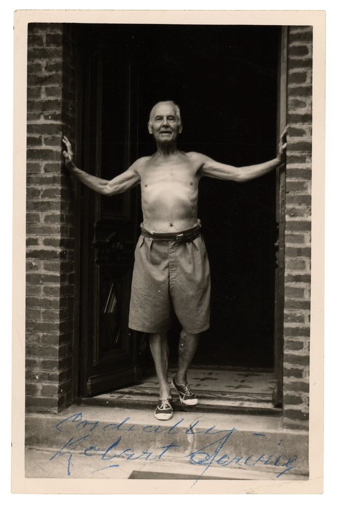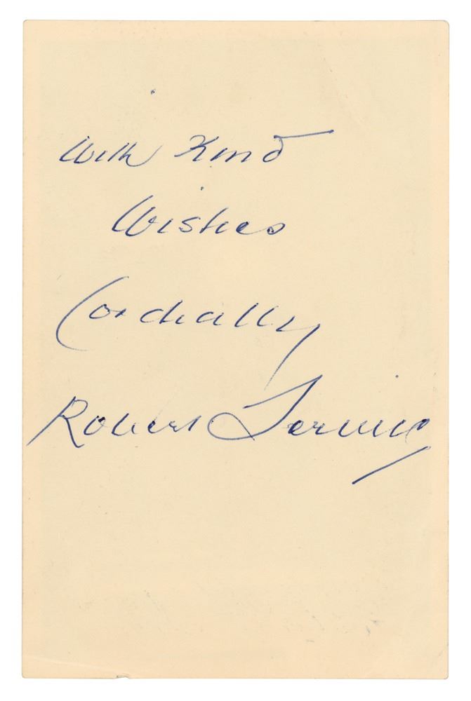 Vintage glossy 3.5 x 5.5 photo of Service standing happily in a doorway without a shirt, signed in blue ballpoint, "Cordially, Robert Service, who also signs on the reverse, "With kind wishes, Cordially, Robert Service." In very good to fine condition, with a paperclip impression to the top edge, and light surface impressions from the additional signature on the back. The first signed photo of Service we have ever offered.