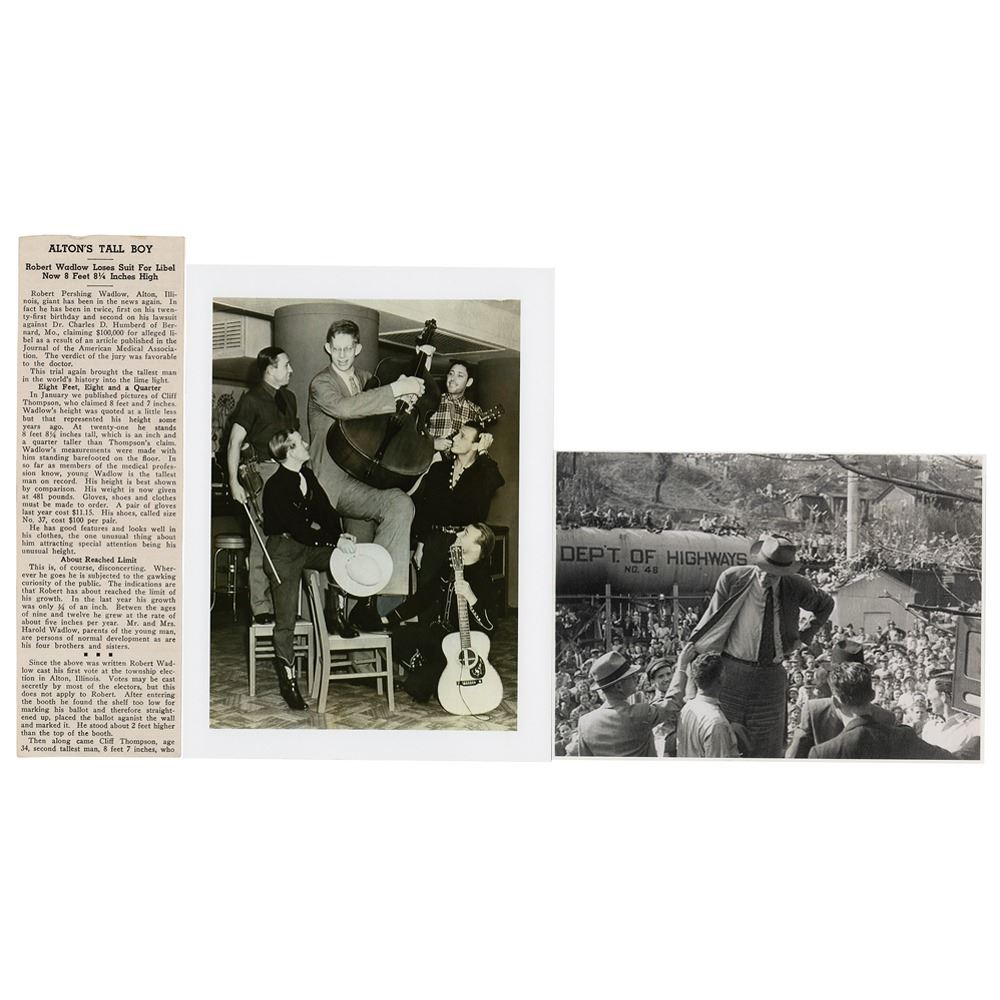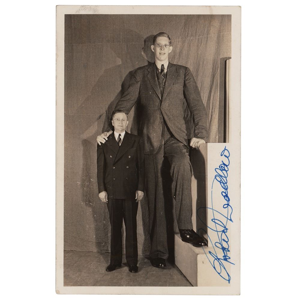 The tallest person in recorded history for whom there is irrefutable evidence (1918-1940). Wadlow's height was 8 ft 11.1 in (2.72 m), while his weight reached 439 lb (199 kg) at his death at the age of 22. His great size and his continued growth in adulthood were due to hypertrophy of his pituitary gland, which results in an abnormally high level of human growth hormone. Vintage glossy 3.5 x 5.55 photo of Robert Wadlow, well over 8 feet in height, standing next to his average-sized father, signed vertically in blue fountain pen. In fine condition, with light surface impressions from notations on the back. Accompanied by two modern glossy photos of Wadlow and a hardcover 1941 edition of the book The Gentleman Giant.