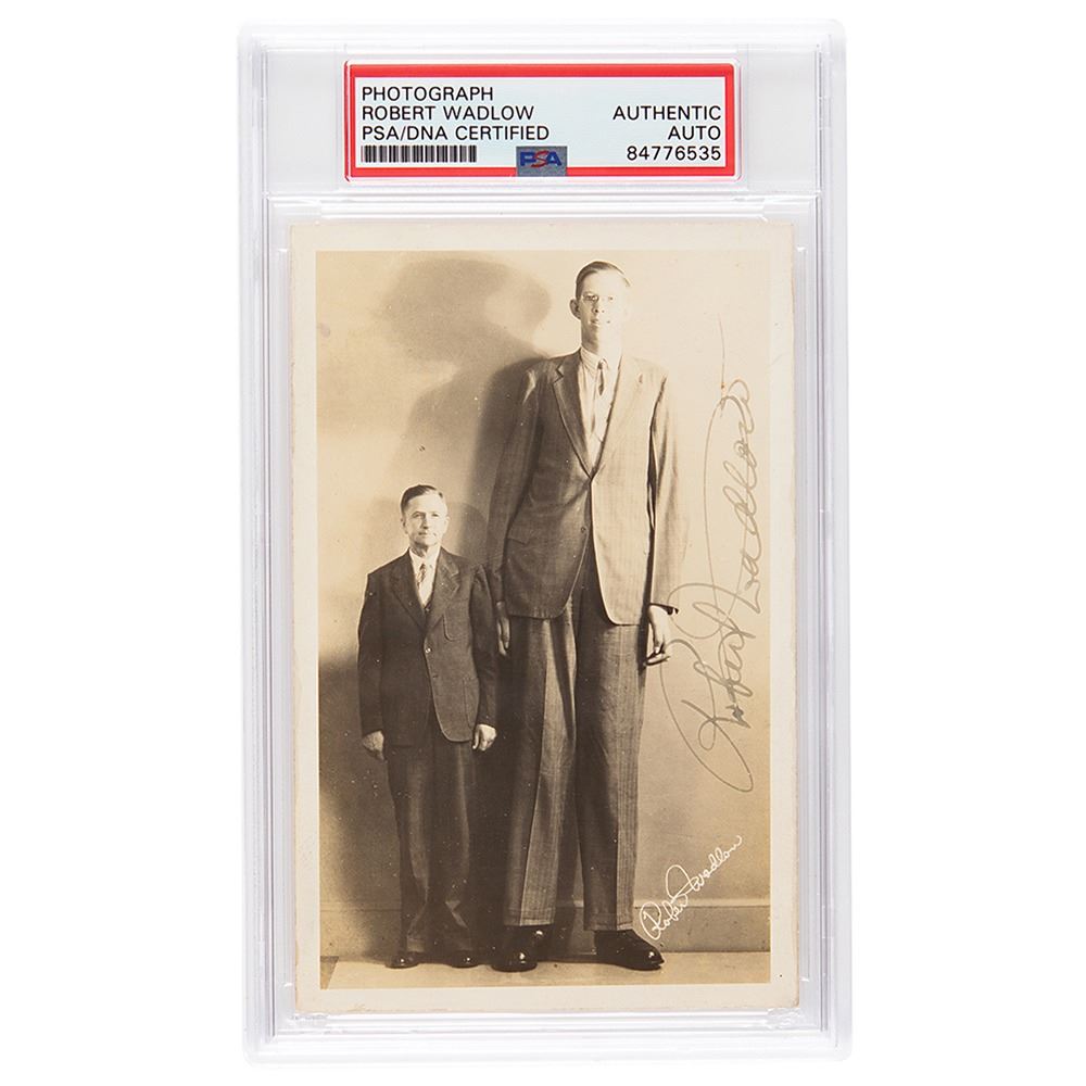 The tallest person in recorded history for whom there is irrefutable evidence (1918-1940). Wadlow& #39;s height was 8 ft 11.1 in (2.72 m), while his weight reached 439 lb (199 kg) at his death at the age of 22. His great size and his continued growth in adulthood were due to hypertrophy of his pituitary gland, which results in an abnormally high level of human growth hormone. Vintage glossy 3.5 x 5.5 photo of Robert Wadlow, well over 8 feet in height, standing next to his average-sized father, signed vertically in fountain pen. In fine condition. Encapsulated in a PSA/DNA authentication holder.