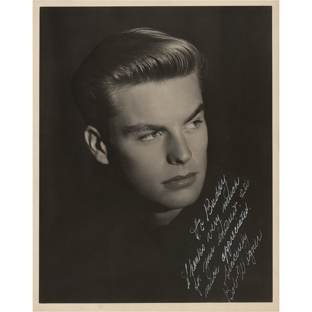 Vintage matte-finish 8 x 10 photo of a young Robert Wagner in a handsome studio pose, signed and inscribed in white fountain pen, "To Buddy, Thanks very much for your interest. It's much appreciated. Sincerely, Bob Wagner.†In fine condition, with one light crease in the lower blank area.