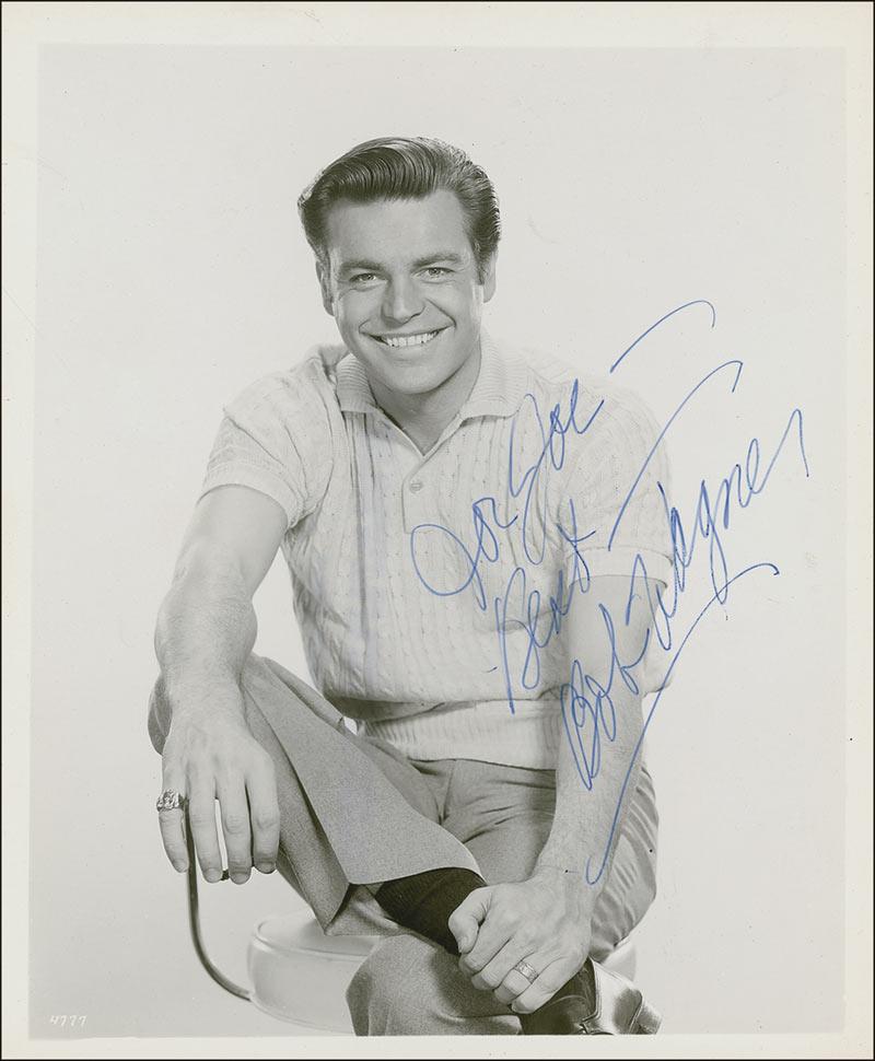 Vintage glossy 8 x 10 photo of the young actor seated on a stool, signed and inscribed in fountain pen “For Joe–Best–Bob Wagner.” MGM promotional information is printed on reverse. In fine condition, with some scattered light creases and surface marks.