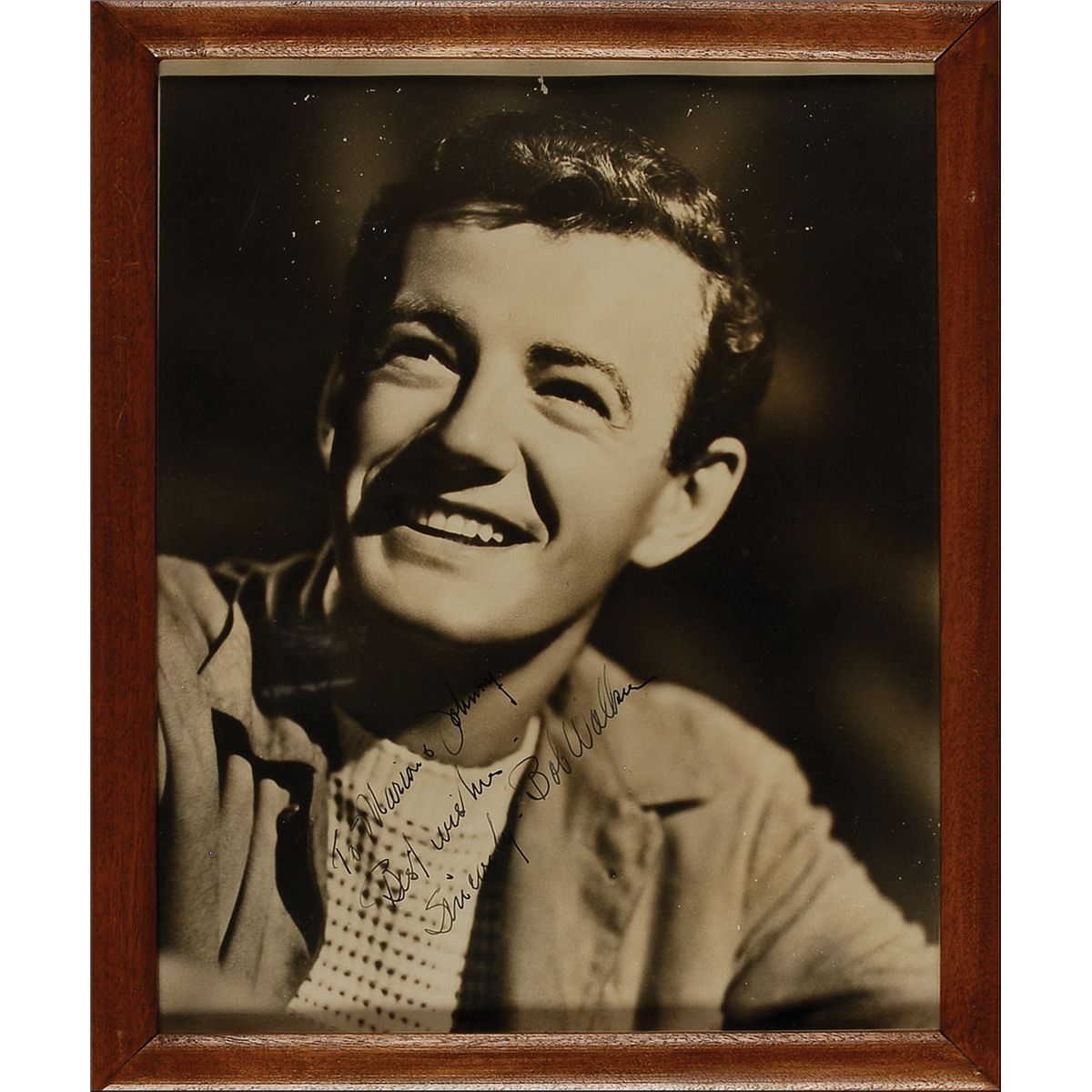 American actor best remembered for his brilliant, chilling portrayal of a soft-spoken psychopath in Alfred Hitchcock’s Strangers on a Train. Walker died at the age of 32 from an adverse reaction to prescription drugs. Vintage matte-finish 7.5 x 9.5 photo, signed and inscribed in fountain pen “To Marion & Johnny, Best wishes, Sincerely, Bob Walker.” Framed to an overall size of 9 x 10.75. In fine condition, with some light surface marks and mild rippling to the top edge.
