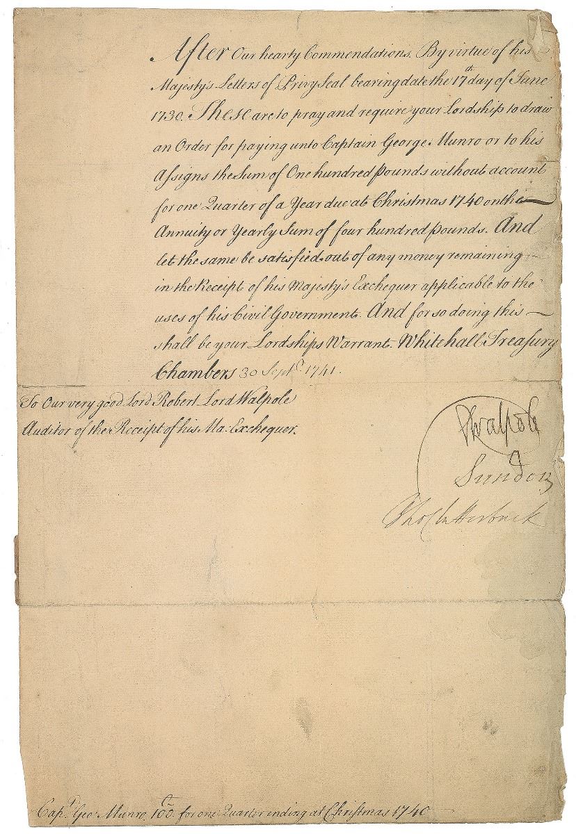 British statesman (1676–1745) considered the first prime minister of Great Britain who served during the reigns of George I and II. Manuscript DS, signed “Walpole,” one page, 9 x 13.5, September 30, 1741. Order for payment “unto Captain George Munro or to his Assigns the Sum of One hundred pounds without account for one Quarter of a Year due at Christmas 1740.” In very good condition, with light staining to right edge and short splits along folds.