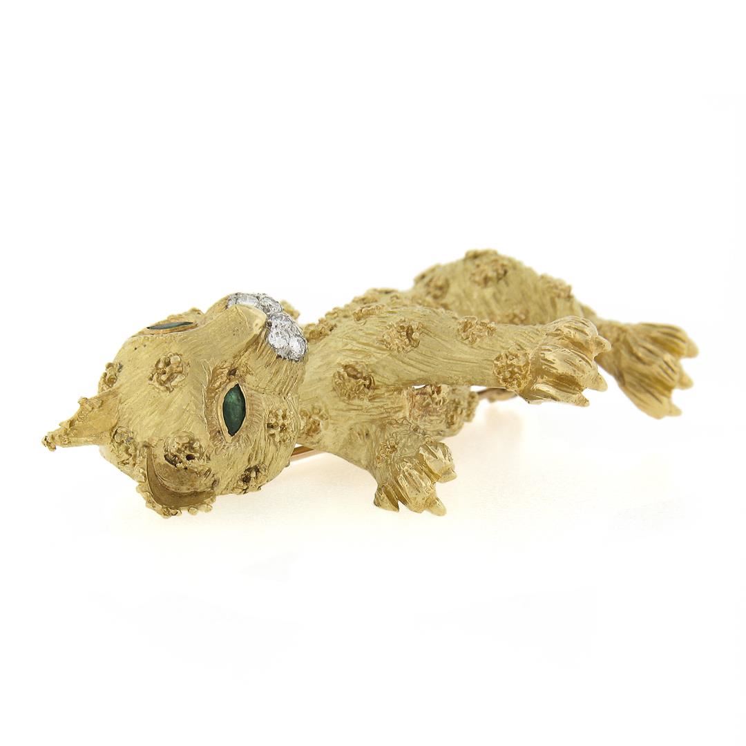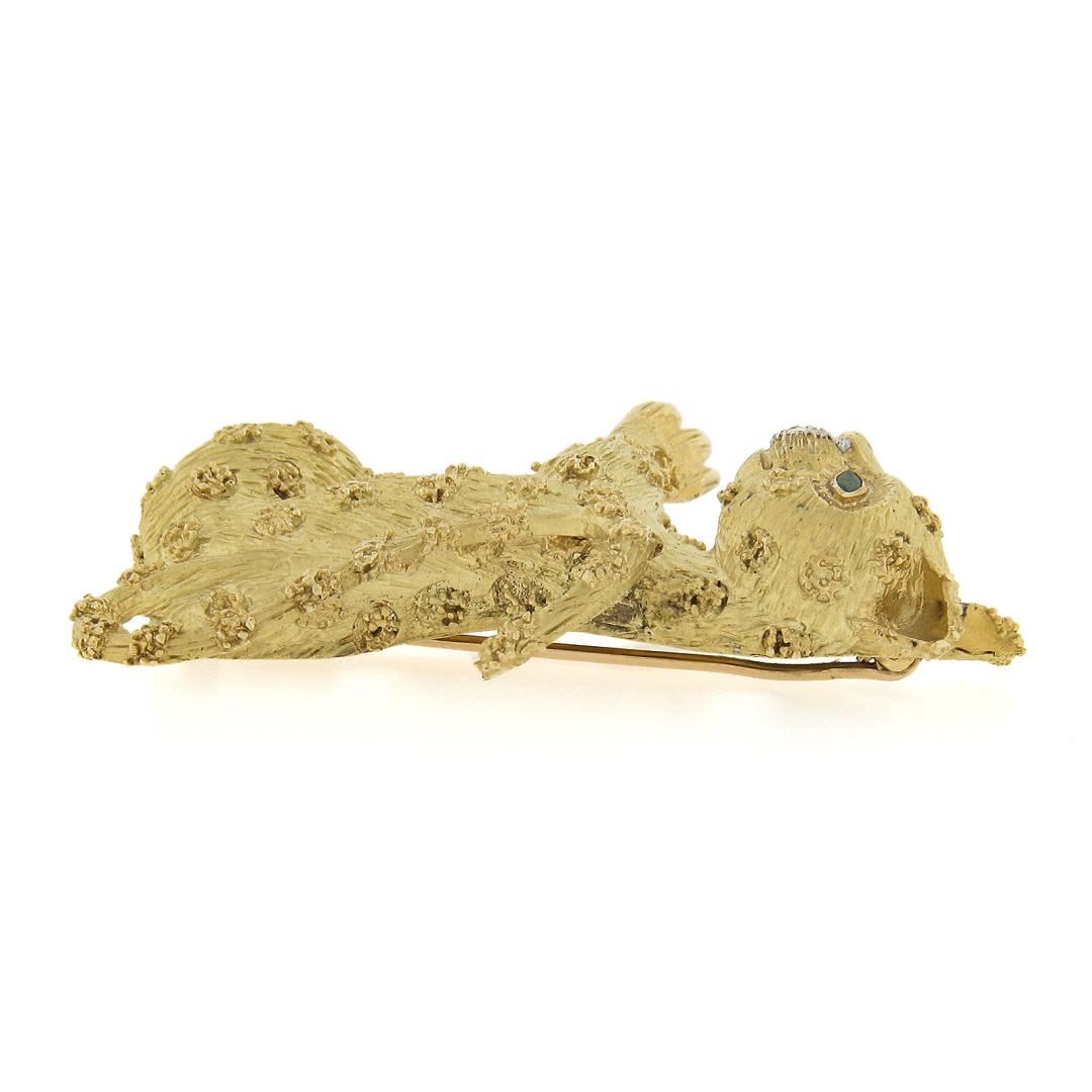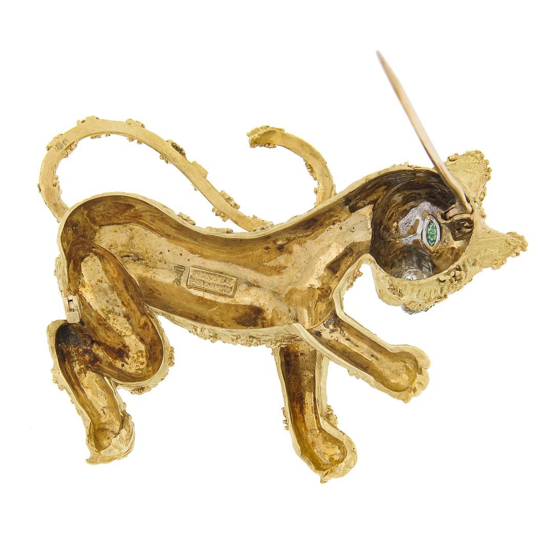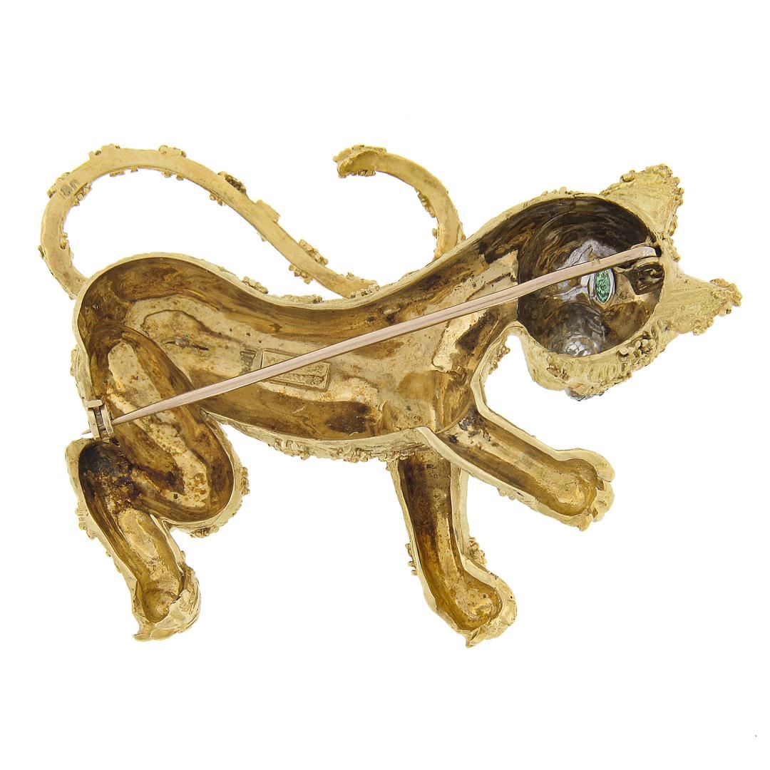A solid 18k yellow gold leopard brooch by Robert Wander, with 2 marquise cut natural emeralds (0.18ctw), and 8 round cut natural diamonds (F/G - VS1/VS2 ; 0.16ctw). Measures 47.5x65.6mm and weighs a total of 43.80 grams.