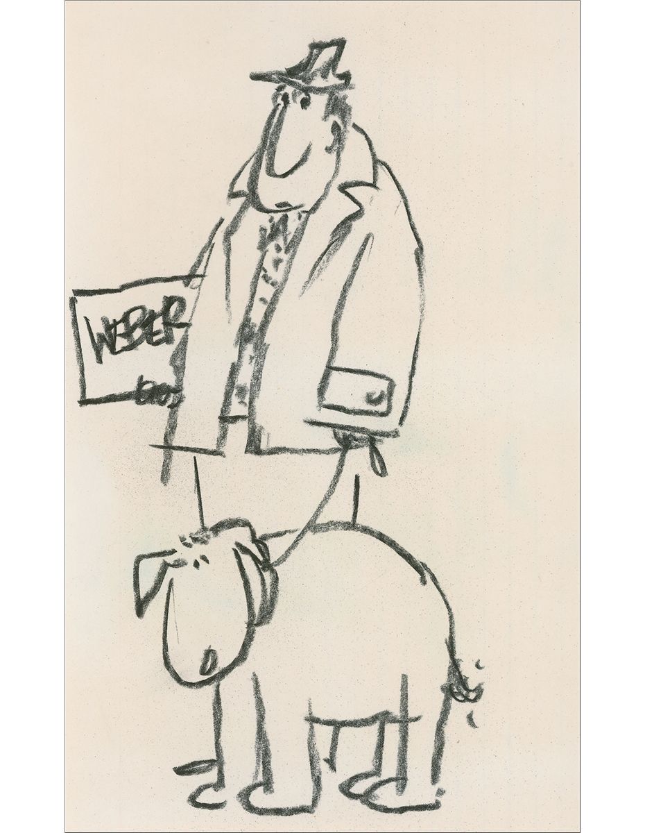 Amercian cartoonist best known for his humorous illustrations for the New Yorker. Original black crayon sketch of a man walking a dog on an off-white 5 x 8 card, signed “Weber.” Small, faint crease to background, otherwise fine condition.