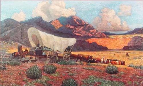 Robert Wesley Amick (1879-1969) (Connecticut) Print, "The Pioneers," sight size 17 5/8" x 29 5/8", printed in the 1920s, Amick studied at the Art Students League of New York and the Yale School of Fine Art, and was a member of the Society of Illustrators and the Society of Independent Artists