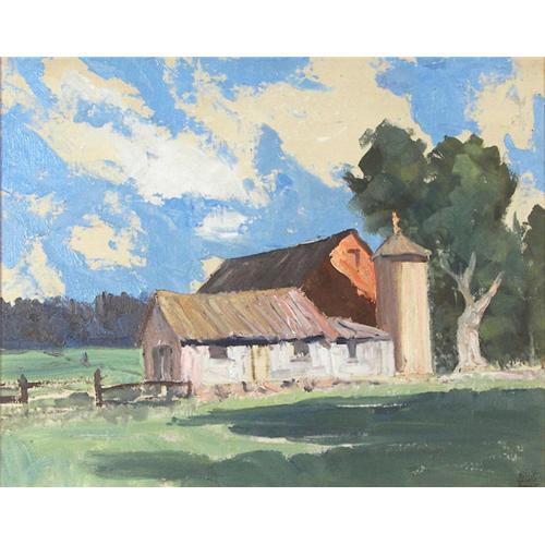 Robert Wesley Amick (1879-1969) Oil on Board, Farm House, circa 1940, 16" x 20", signed lower right