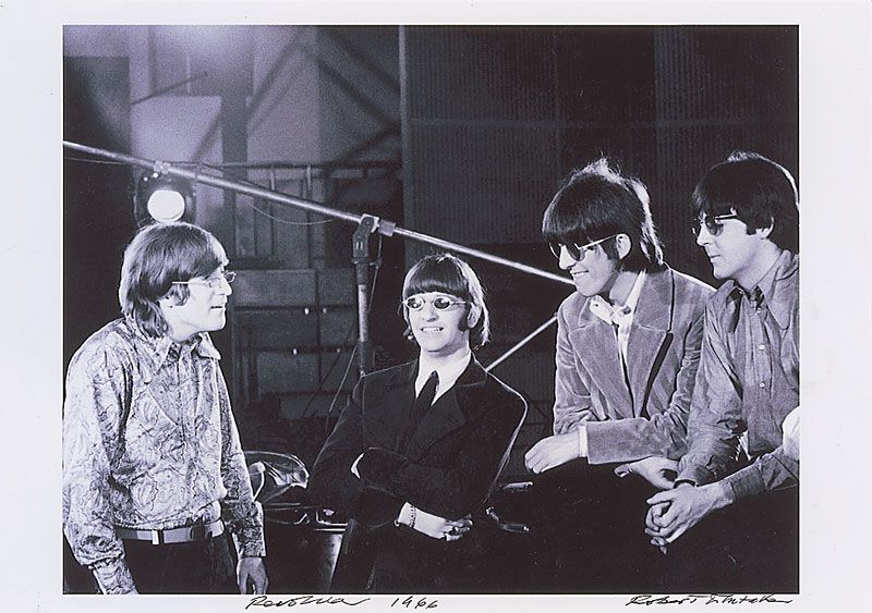Exceptional 11.5 x 8.25 laser print photo of the Beatles, originally taken by Whitaker during the Revolver recording sessions, signed in the lower border in black ink, “Revolver 1966 Robert Whitaker.” In fine condition. Accompanied by a certificate of authenticity from Tracks.