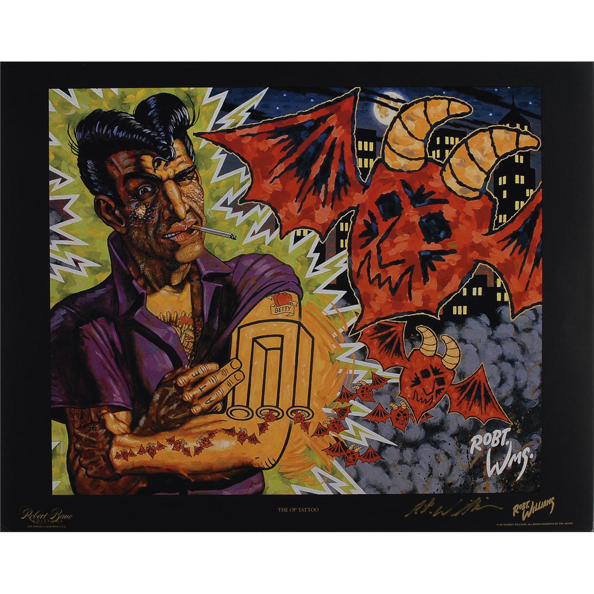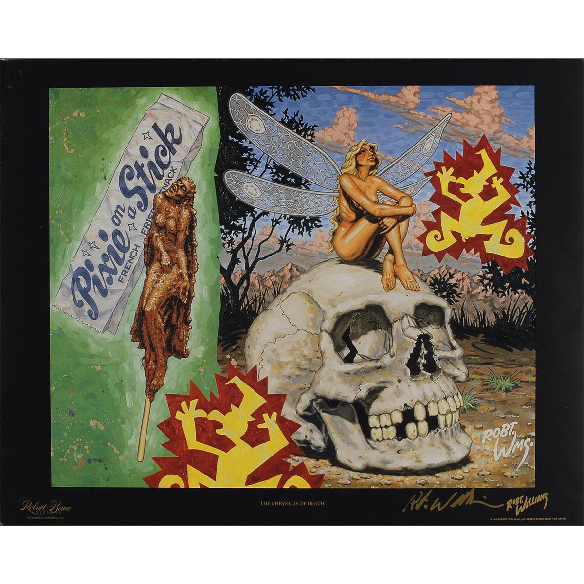 Two lithographs, 20.25 x 16.25, entitled “The Chrysalis of Death” and “The Op Tattoo,” respectively, signed in gold ink by Robert Williams. In fine condition, with scattered light creasing, edge wear, and corner bends that can be matted out.