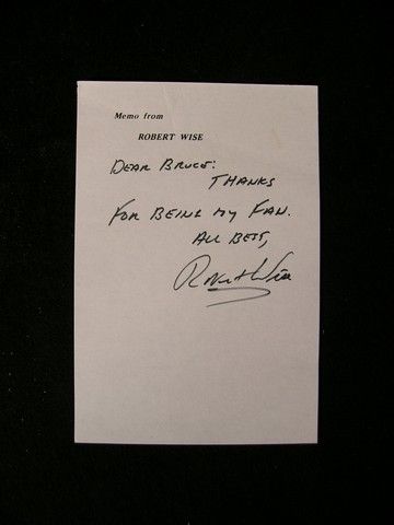 One of the greatest directors to have ever filmed a scene. This is a lot of (2) autographed items from legendary producer/director Robert Wise. Robert Wise has directed such Hollywood classics as 'The Day the Earth Stood Still,' 'West Side Story,' 'The Andromeda Strain,' and of course 'The Sound of Music.' The lot includes an autograph on his personal memo paper, and another from an article on 'The Directors' which contains a story about the director himself. (the clipping measures approx. 8 1/2"x 11" and the memo approx. 4"x 6")