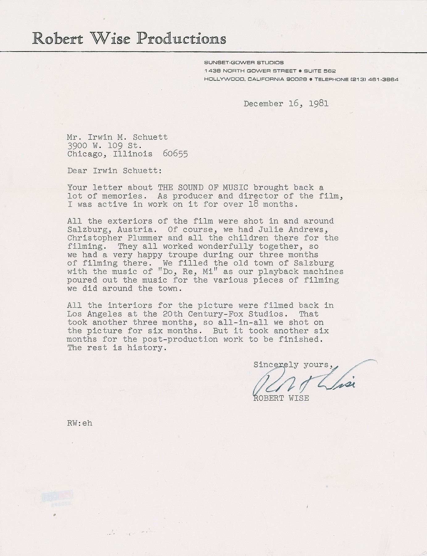 TLS, one page, 8.5 x 11, Robert Wise Productions letterhead, December 16, 1981. Letter to Irwin M. Schuett, in full: "Your letter about The Sound of Music brought back a lot of memories. As producer and director of the film, I was active in work on it for over 18 months. All the exteriors of the film were shot in and around Salzburg, Austria. Of course, we had Julie Andrews, Christopher Plummer and all the children there for the filming. They all worked wonderfully together, so we had a very happy troupe during our three months of filming there. We filled the old town of Salzburg with the music of 'Do, Re, Mi' as our playback machines poured out the music for the various pieces of filming we did around the town. All the interiors for the picture were filmed back in Los Angeles at the 20th Century-Fox Studios. That took another three months, so all-in-all we shot on the picture for six months. But it took another six months for the post-production work to be finished. The rest is history." In fine condition, with show-through from a PSA/DNA sticker on the reverse. Accompanied by a certificate of authenticity from PSA/DNA.