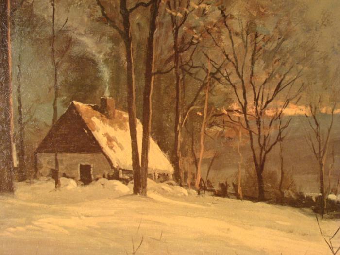 The large width of this artwork gives one the feeling of being along a snowy creek, while the last leaves of autumn hang on the trees. Artist: Robert Wood; printed signature lower left, and plaque at the lower center Title: Approach of Winter Medium: Print on textured paper Image size: 23 1/2 x 47 1/2 inches Framing: Dark brown wood frame, and tan linen matting and inner gold frame Frame size: 28 x 52 inches Condition: Very good; a few light stains on the matte, and scuffs on the frame Bring this scene of the changing season to any room.Robert Wood is the most prolific painter of American landscapes. The English born Wood had a father who was a Victorian painter, and his art was encourage at an early age. He studied painting in nearby Folkstone. He emigrated to America, where traveled as a hobo, hopping freight cars and selling paintings. He moved around to different parts of the country, from Illinois to Ohio to Texas to California. His work became well recognized. The American Express Company commissioned him to paint a series of six paintings that would be produced as prints for their cardholders, all portraying National Parks. Today his work is well loved and collected widely.