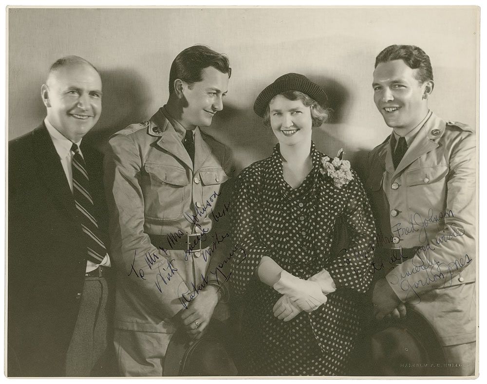 Vintage matte-finish 13.5 x 10.75 Malcolm F. C. Bulloch photo of Young with a few friends, signed and inscribed in fountain pen, “To Mr. & Mrs. Johnson, With sincere best wishes, Robert Young,” and also signed and inscribed by Gordon Jones. In fine condition, with a few trivial creases and imprints.
