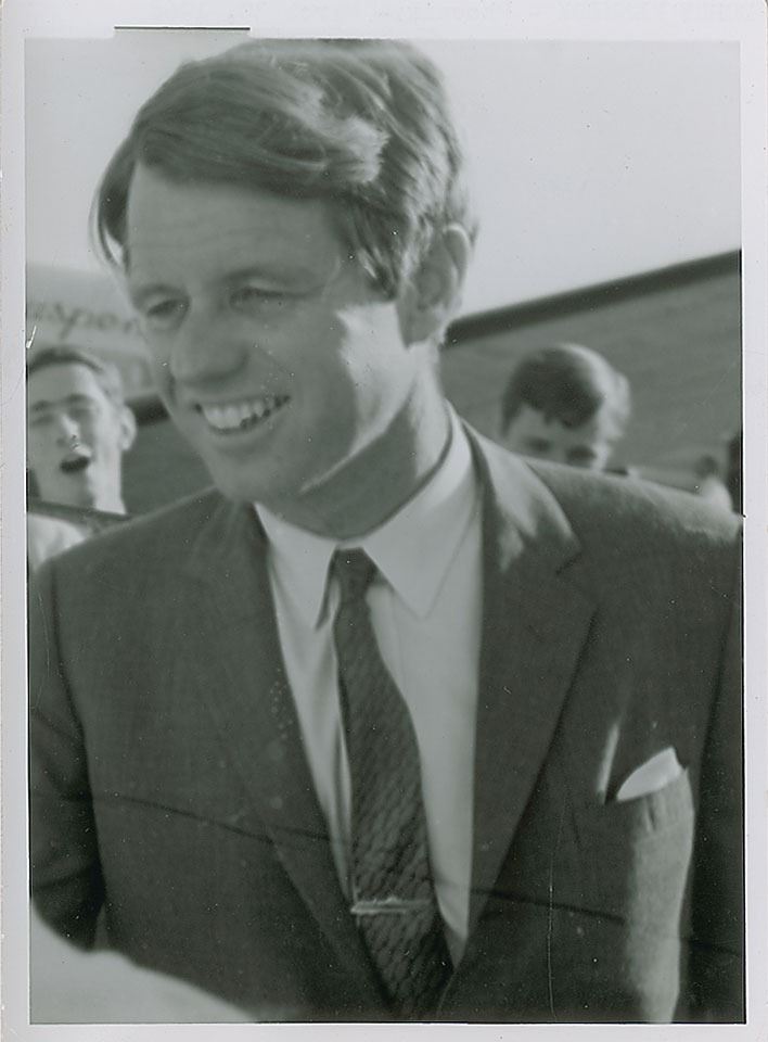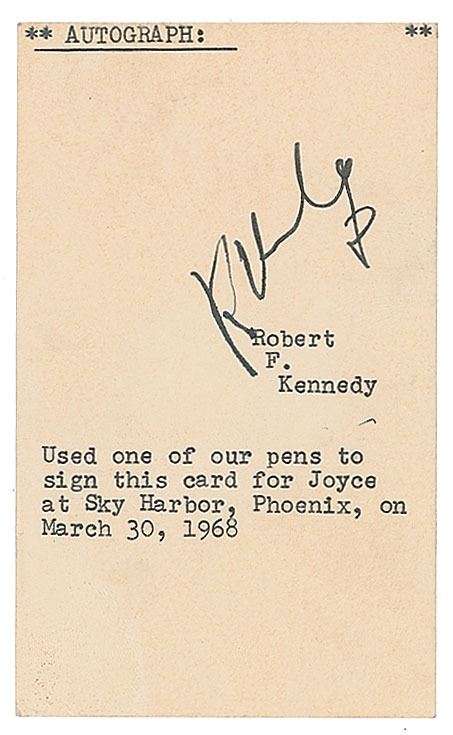 Vintage ink signatures, "R. Kennedy" and "Ethel Kennedy," on individual off-white 3 x 5 cards, both bearing typed collector's notations indicating that they were signed at Sky Harbor, Phoenix, on March 30, 1968. Includes two original vintage glossy candid photographs from the event, which took place during Kennedy's campaign for the presidency. In fine condition, with some creasing to the photos. Accompanied by a brochure outlining Robert F. Kennedy's campaign platform.