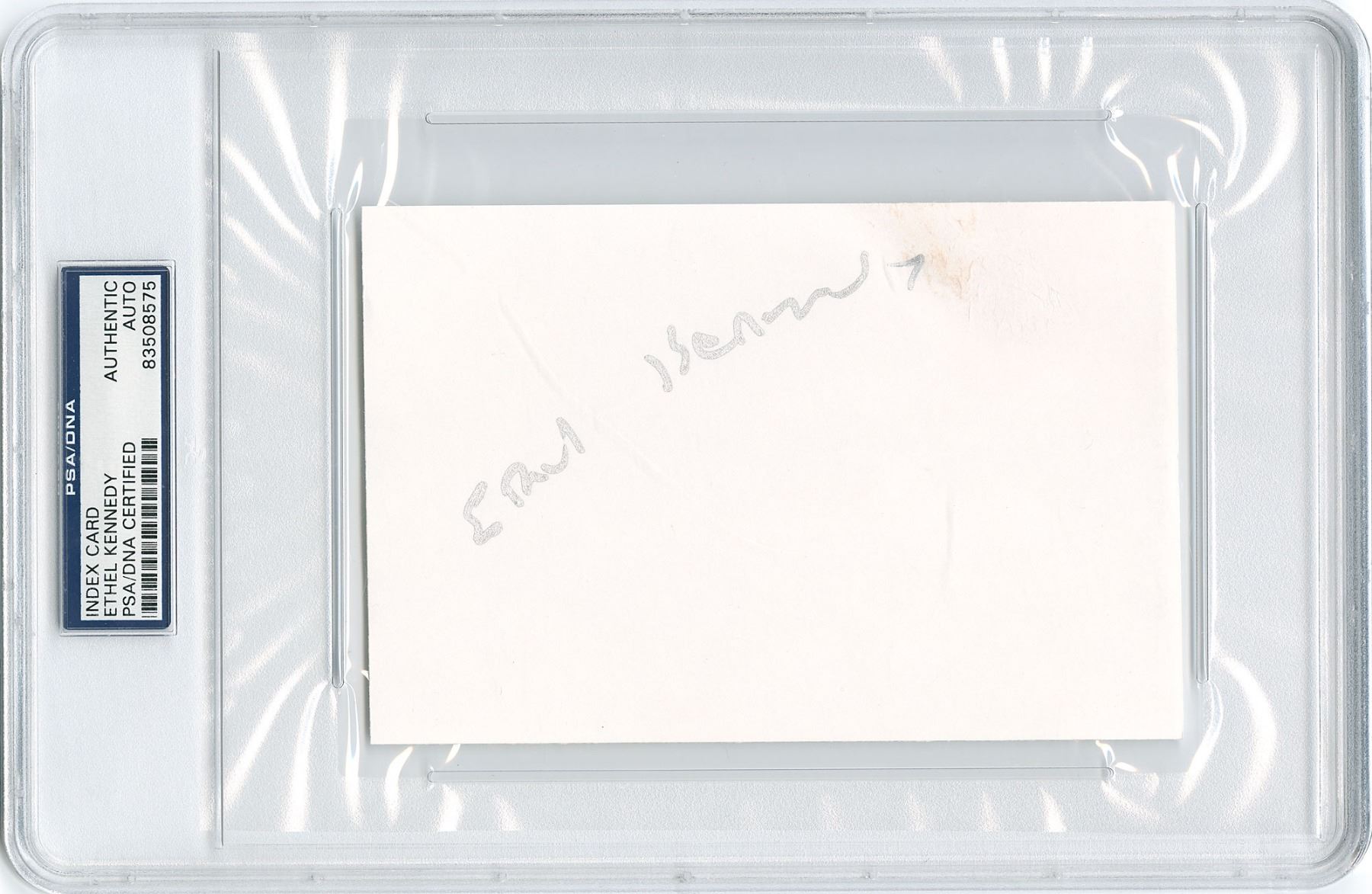Two signatures: a vintage ballpoint signature of Robert F. Kennedy on an off-white 6 x 4 card; and a modern silver ink signature of Ethel Kennedy on a white 6 x 4 card, with a collector's notation on the reverse indicating that it was obtained in 1994. In overall fine condition.