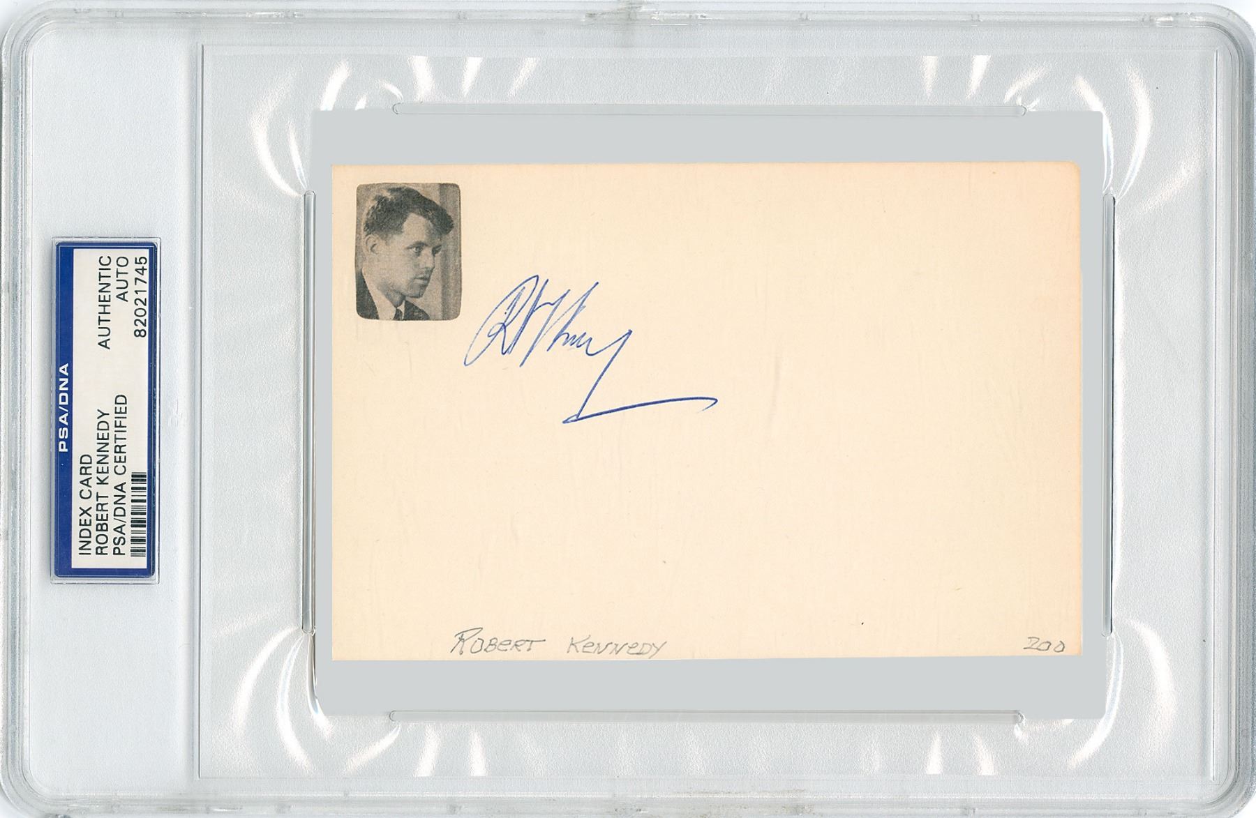 Two signatures: a vintage ballpoint signature of Robert F. Kennedy on an off-white 6 x 4 card; and a modern silver ink signature of Ethel Kennedy on a white 6 x 4 card, with a collector's notation on the reverse indicating that it was obtained in 1994. In overall fine condition.