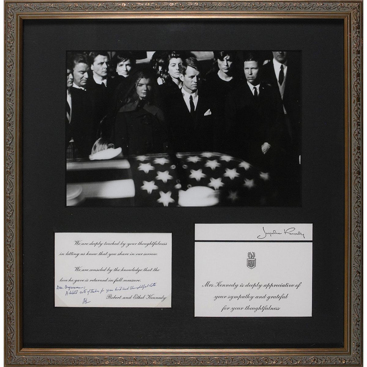 Two mourning cards: one issued by Robert and Ethel Kennedy following the death of JFK, 4.75 x 3, with a brief ANS by Robert in the lower left corner in blue ballpoint, “Dear Congressman, A belated note of thanks for your kind and thoughtful letter. Bob”; and the other issued by Jacqueline Kennedy, bearing her pre-printed signature in the upper right. Both are matted and framed with a photo from the funeral to an overall size of 14.5 x 15. In overall fine condition.
