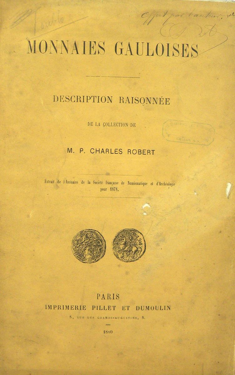 Robert, P. Charles. MONNAIES GAULOISES. DESCRIPTION RAISONNÉE DE LA COLLECTION DE M. P. CHARLES ROBERT. Paris, 1880. 4to, original printed wraps. 109, (3) pages; text illustrations; 1 very fine plate of coins. Inscribed by the author on the front wrap. Wraps a bit worn, with some small holes; marginal discoloration and tears. Very good. Extrait de l’Annuaire de la Société française de Numismatique et d’Archéologie pour 1878. Very rare: the first copy we have handled in at least 25 years. Babelon 225. Engel & Serrure 5486.