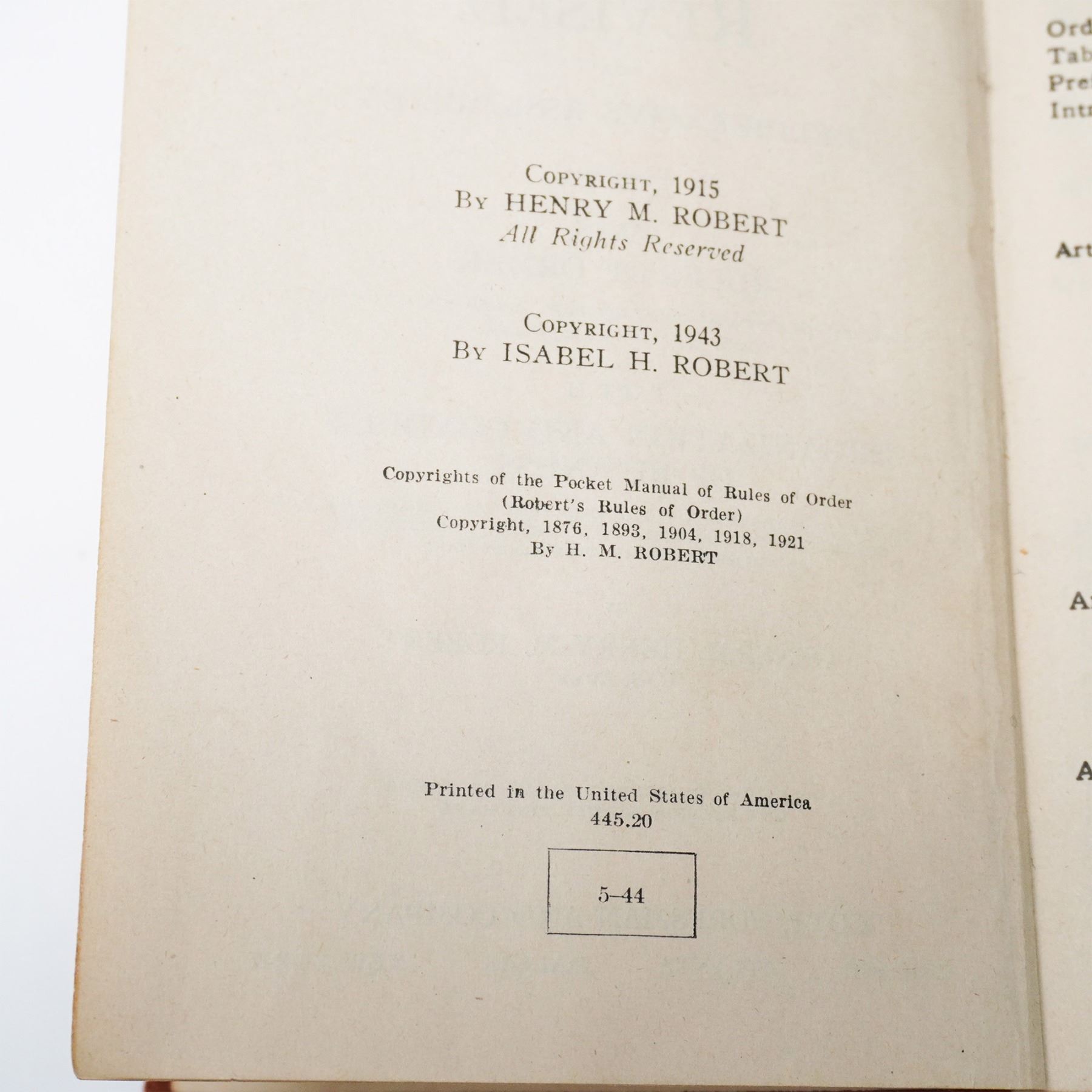 A vintage copy of Robert's Rules of Order Revised, originally authored by Henry M. Robert, with this edition copyrighted in 1943 by Isabel H. Robert. This classic parliamentary guidebook, first published in 1876, has been a fundamental resource for conducting meetings and ensuring proper procedural conduct. The hardcover binding features a brown cloth cover with black border accents. The copyright page notes prior copyrights from 1876, 1893, 1904, 1915, 1918, and 1921, with this edition printed in the United States.