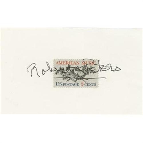 <B>Roberta Peters Autograph.</B></I> A 5" x 3" card, with a five-cent commemorative postage stamp affixed, autographed by celebrated operatic soprano in black ink. Peters' signature spans across the face of the stamp and is large and clean. In Excellent condition.<BR><BR><b>Shipping:</b> Flat Material, Small (<a target="_blank" href="http://www.heritageauctions.com/common/shipping.php">view shipping information</a>)