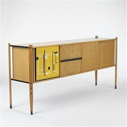 Roberto Aloi credenza Italy, c. 1955 oak, enameled steel, printed plastic, glass 80.25 w x 18.25 d x 35.25 h inches Two sliding doors conceal two adjustable shelves and two doors conceal storage compartment.