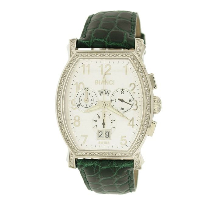 This Roberto Bianci diamond timepiece features: genuine diamonds G-H VS (84pcs individually set), 0.57 cts total weight, Swiss chronograph movement with day and date, sapphire crystal, textured dial, all stainless steel case and genuine alligator strap . Watch is water resistant and includes a three year manufacturer's warranty.