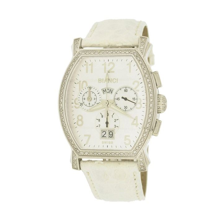 This Roberto Bianci diamond timepiece features: genuine diamonds G-H VS (84pcs individually set), 0.57 cts total weight, Swiss chronograph movement with day and date, sapphire crystal, textured dial, all stainless steel case and genuine alligator strap . Watch is water resistant and includes a three year manufacturer's warranty.