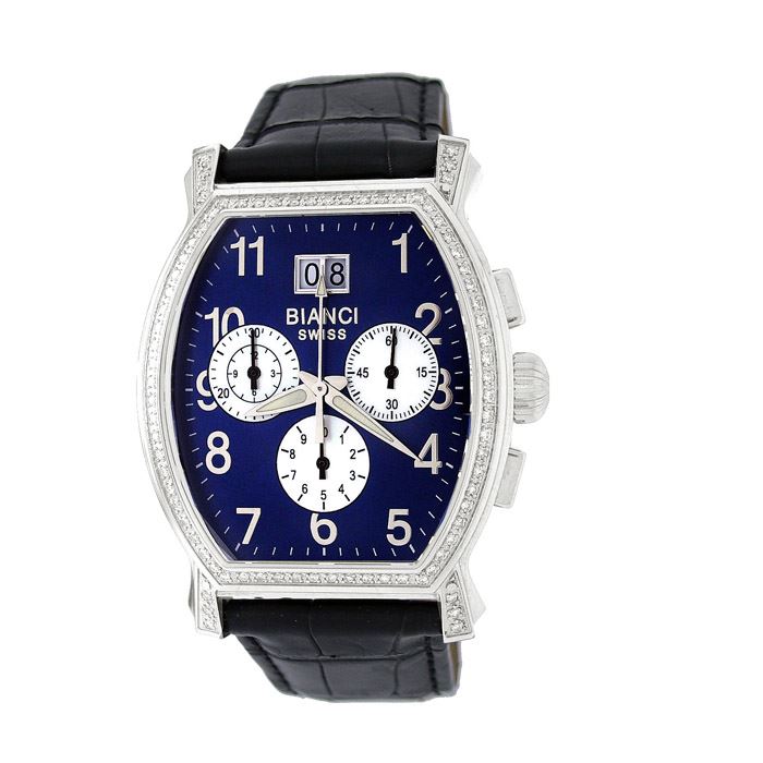 This Roberto Bianci diamond timepiece features: genuine diamonds G-H VS (84pcs individually set), 0.57 cts total weight, Swiss chronograph movement with day and date, sapphire crystal, textured dial, all stainless steel case and genuine alligator strap . Watch is water resistant and includes a three year manufacturer's warranty.