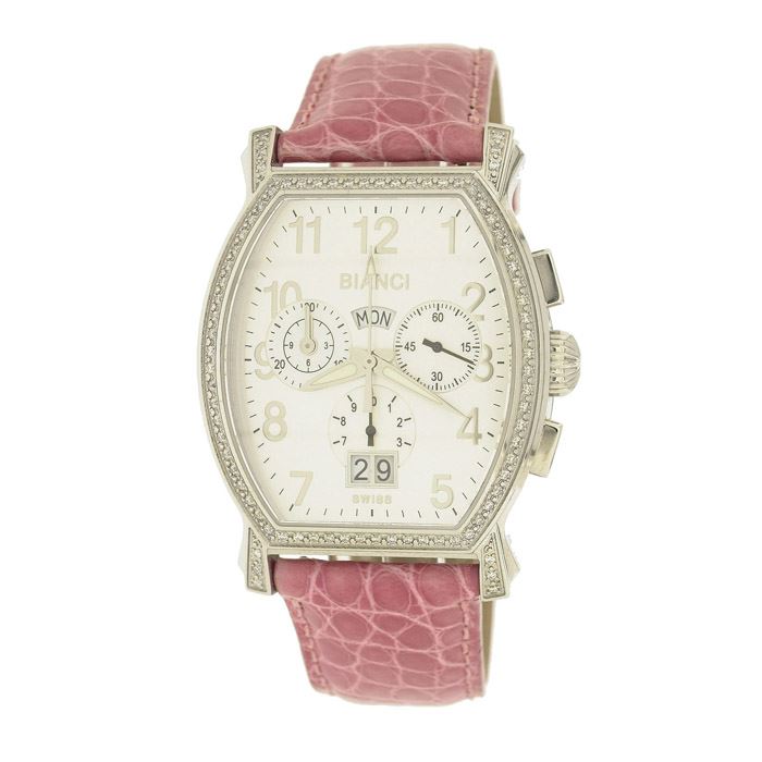 This Roberto Bianci diamond timepiece features: genuine diamonds G-H VS (84pcs individually set), 0.57 cts total weight, Swiss chronograph movement with day and date, sapphire crystal, textured dial, all stainless steel case and genuine alligator strap . Watch is water resistant and includes a three year manufacturer's warranty.