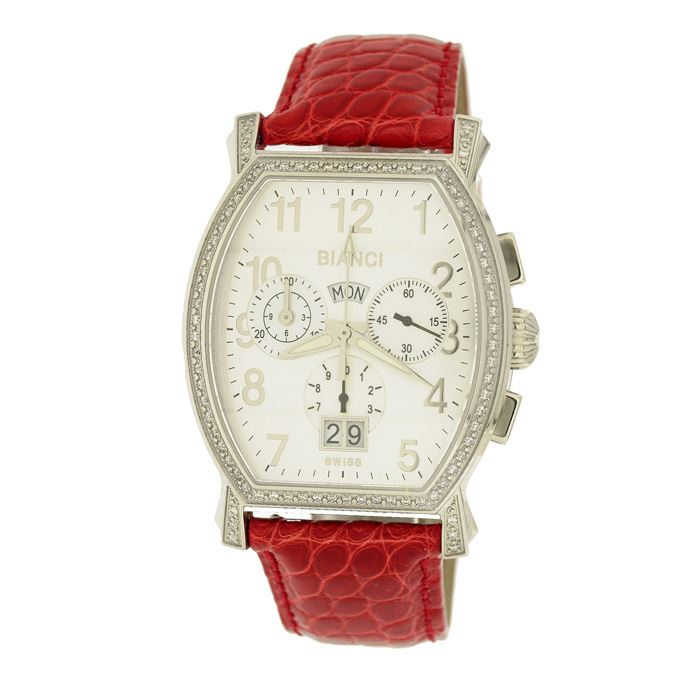 This Roberto Bianci diamond timepiece features: genuine diamonds G-H VS (84pcs individually set), 0.57 cts total weight, Swiss chronograph movement with day and date, sapphire crystal, textured dial, all stainless steel case and genuine alligator strap . Watch is water resistant and includes a three year manufacturer's warranty.