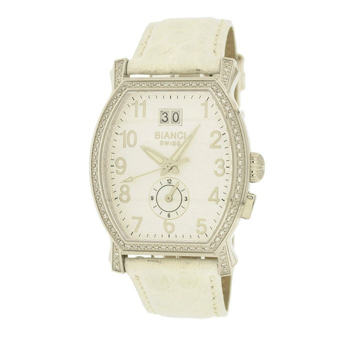 This Roberto Bianci diamond timepiece features: genuine diamonds G-H VS (84pcs individually set), 0.57 cts total weight, Swiss movement with dual time zone (two time zone) and date, sapphire crystal, textured dial, all stainless steel case and genuine alligator strap . Watch is water resistant and includes a three year manufacturer's warranty.