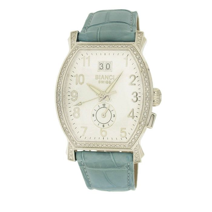 This Roberto Bianci diamond timepiece features: genuine diamonds G-H VS (84pcs individually set), 0.57 cts total weight, Swiss movement with dual time zone (two time zone) and date, sapphire crystal, textured dial, all stainless steel case and genuine alligator strap . Watch is water resistant and includes a three year manufacturer's warranty.