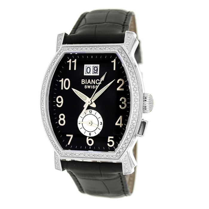 This Roberto Bianci diamond timepiece features: genuine diamonds G-H VS (84pcs individually set), 0.57 cts total weight, Swiss movement with dual time zone (two time zone) and date, sapphire crystal, textured dial, all stainless steel case and genuine alligator strap . Watch is water resistant and includes a three year manufacturer's warranty.