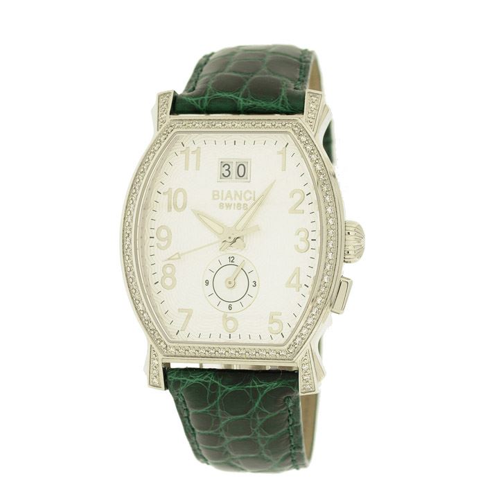 This Roberto Bianci diamond timepiece features: genuine diamonds G-H VS (84pcs individually set), 0.57 cts total weight, Swiss movement with dual time zone (two time zone) and date, sapphire crystal, textured dial, all stainless steel case and genuine alligator strap . Watch is water resistant and includes a three year manufacturer's warranty.
