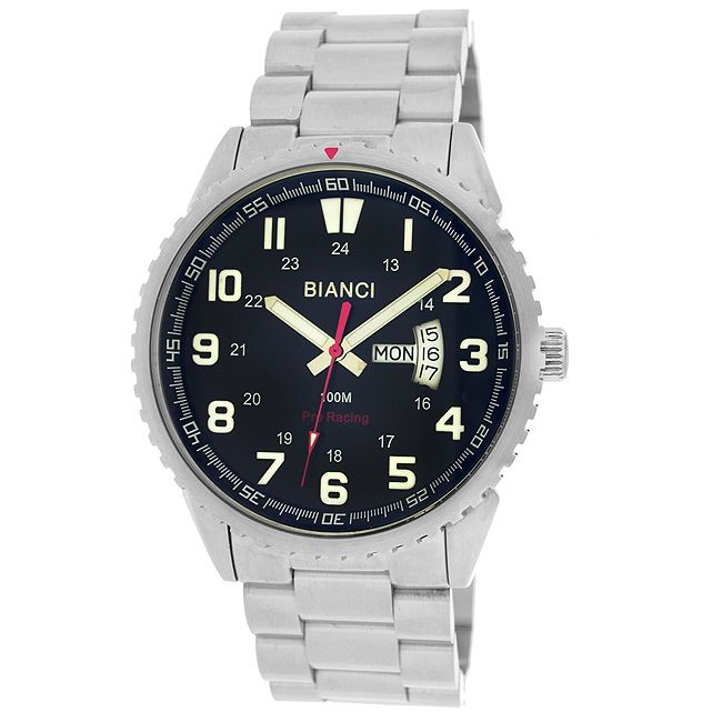 The Bianci Pro Racing collection is HOT!!! In a racing environment where every second and minute counts, this high performance watch will exceed all expectations. The masterfully designed timepiece features an all brushed stainless steel case and band, Swiss quartz movement with day and date, sapphire coated antireflective crystal, textured dial with luminous hands and hour markers, fold-over deployment buckle with pushers and security latch, and push/pull crown. This affordable designer watch is 10 ATM water resistant and includes a three year manufacturer's warranty.