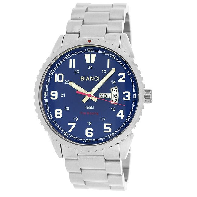 The Bianci Pro Racing collection is HOT!!! In a racing environment where every second and minute counts, this high performance watch will exceed all expectations. The masterfully designed timepiece features an all brushed stainless steel case and band, Swiss quartz movement with day and date, sapphire coated antireflective crystal, textured dial with luminous hands and hour markers, fold-over deployment buckle with pushers and security latch, and push/pull crown. This affordable designer watch is 10 ATM water resistant and includes a three year manufacturer's warranty.