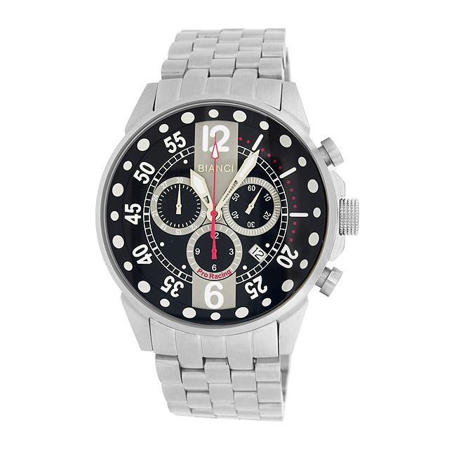The Bianci Pro Racing collection is HOT!!! In a racing environment where every second and minute counts, this high performance watch will exceed all expectations. The masterfully designed timepiece features an all brushed stainless steel case and band, Swiss chronograph movement with date, sapphire coated antireflective crystal, textured dial with luminous hands and hour markers, fold-over deployment buckle with pushers and security latch, and push/pull crown. This affordable designer watch is 10 ATM water resistant and includes a three year manufacturer's warranty.