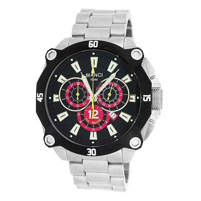 The Bianci Pro Racing collection is HOT!!! In a racing environment where every second and minute counts, this high performance watch will exceed all expectations. The masterfully designed timepiece features an all brushed stainless steel case and band with black plated bezel, Swiss chronograph movement with date, sapphire coated antireflective crystal, textured dial with luminous hands and hour markers, fold-over deployment buckle with pushers and security latch, and push/pull crown. This affordable designer watch is 10 ATM water resistant and includes a three year manufacturer's warranty.