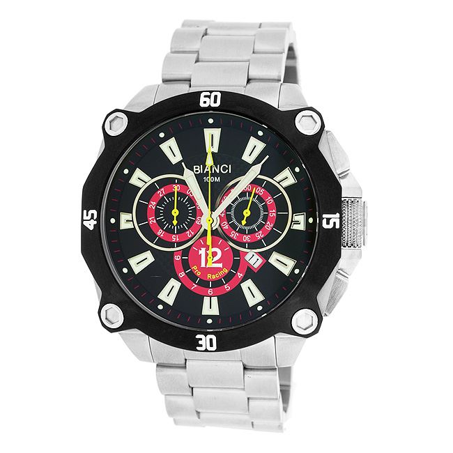 The Bianci Pro Racing collection is HOT!!! In a racing environment where every second and minute counts, this high performance watch will exceed all expectations. The masterfully designed timepiece features an all brushed stainless steel case and band with black plated bezel, Swiss chronograph movement with date, sapphire coated antireflective crystal, textured dial with luminous hands and hour markers, fold-over deployment buckle with pushers and security latch, and push/pull crown. This affordable designer watch is 10 ATM water resistant and includes a three year manufacturer's warranty.